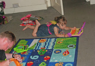 We all received lovely gifts, but Hannah received so many gifts from friends and family, it was almost embarrassing. Here she is, wearing her beads, and with her "dinosaurs" and other gifts nearby, playing with her "computer", while Arthur tries out her magnetic drawing slate.